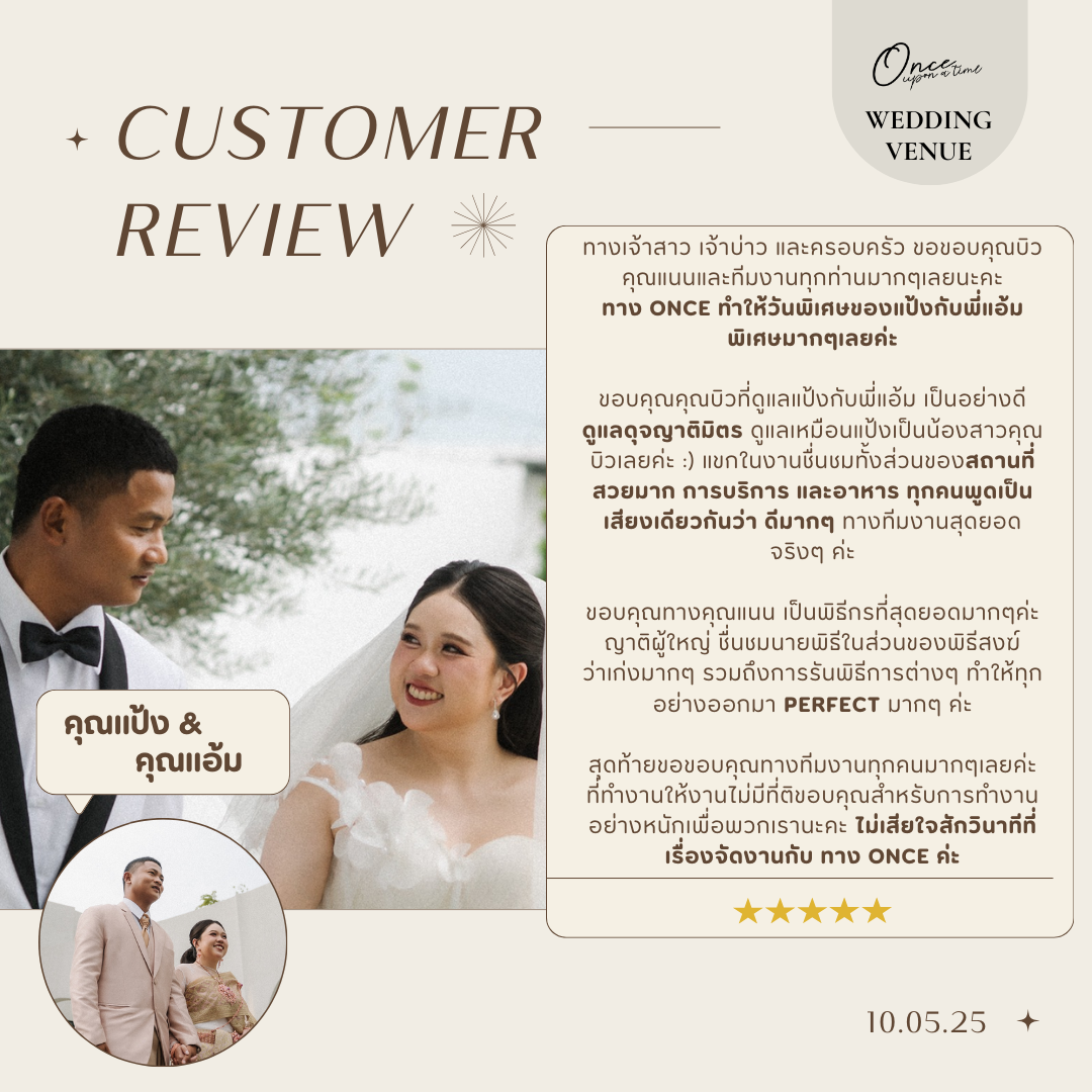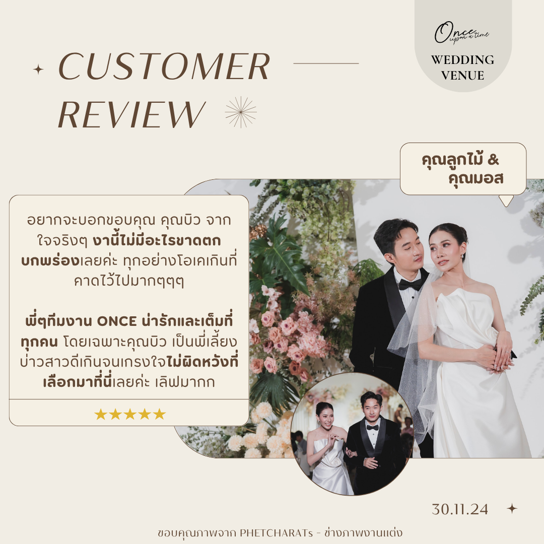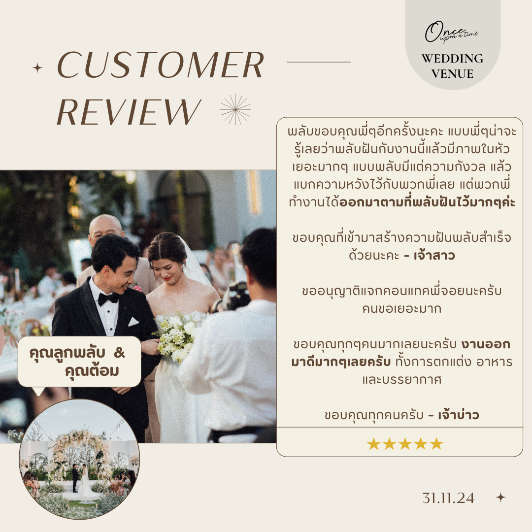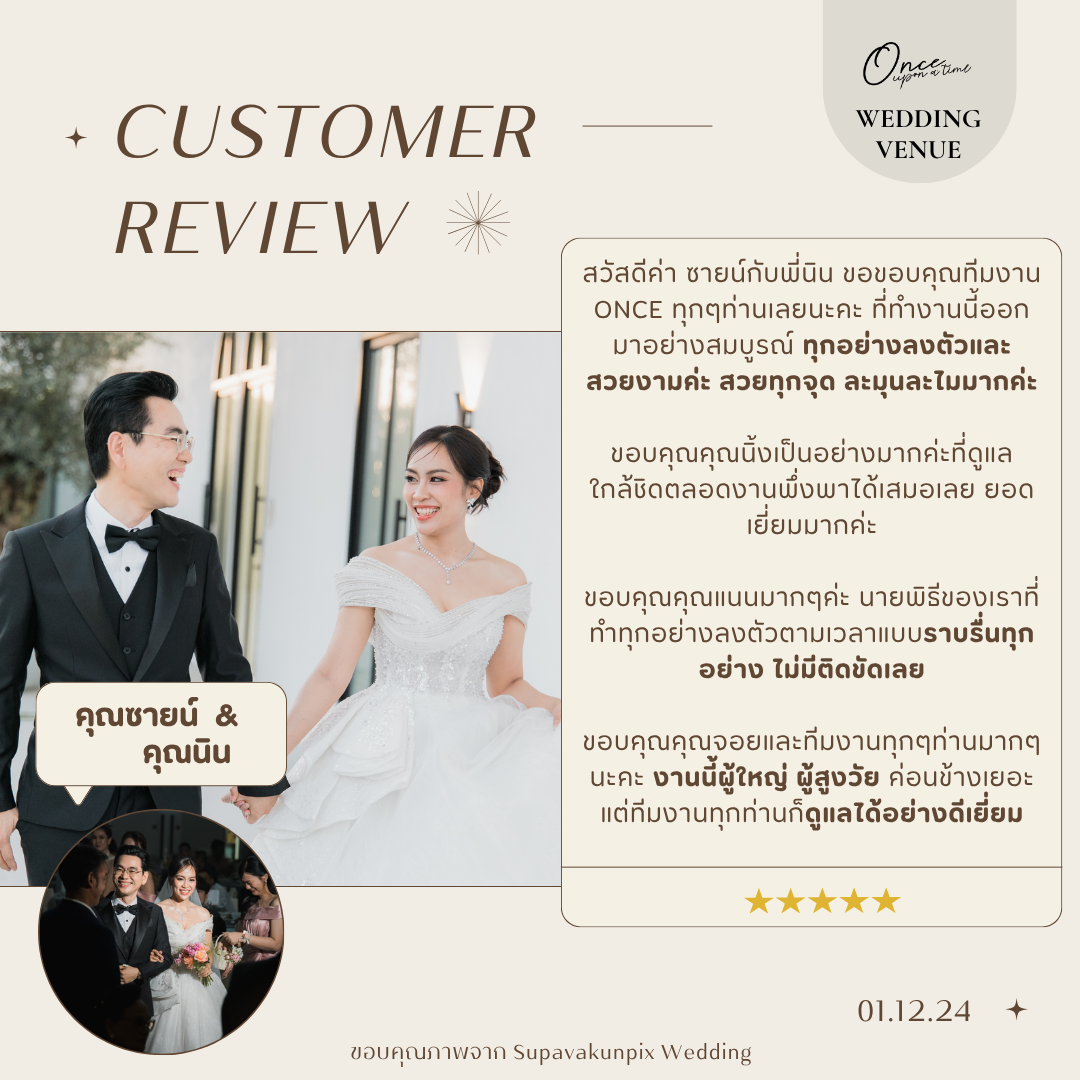 #reviewonceuponatimeขอบคุณจากหัวใจถึง 'คุณซายน์และคุณนิน' ขอบคุณที่ไว้วางใจ Once ในวันสำคัญที่สุดของชีวิตทีมงานทุกคนปลื้มใจมากที่ได้เป็นส่วนหนึ่งในความทรงจำครั้งนี้ อ่านรีวิวแล้วหายเหนื่อยเลยค่ะ ขอบคุณที่มองเห็นทุกความตั้งใจของพวกเราตั้งแต่ความละมุนของสถานที่ ไปจนถึงความใส่ใจเล็กๆ อย่างการดูแลผู้สูงวัยตลอดทั้งงาน ยินดีที่ได้ "สานฝัน" ให้วันสำคัญของคุณทั้งสอง ออกมา สมบูรณ์แบบ อย่างที่ตั้งใจค่ะ ขอให้รักครั้งนี้งดงามและยั่งยืนตลอดไปนะคะ "