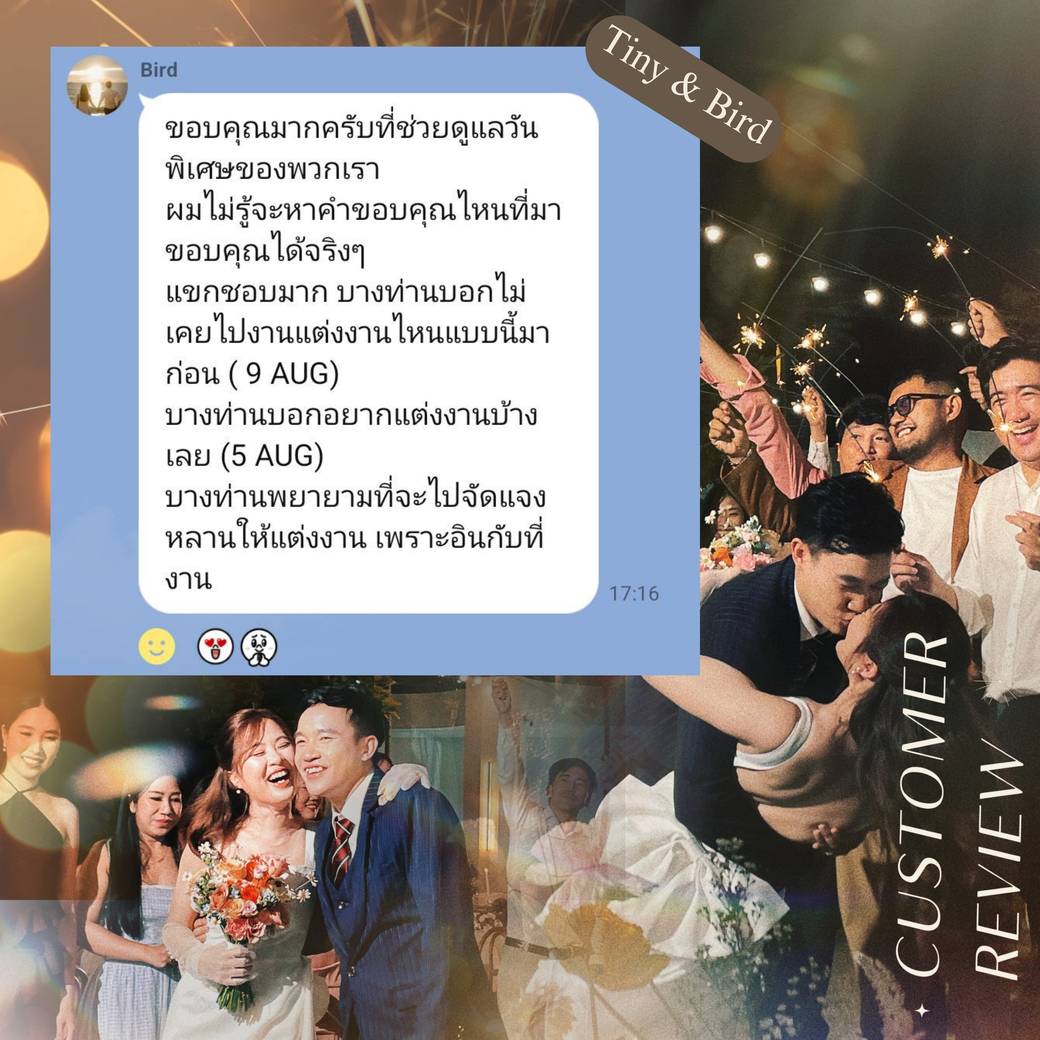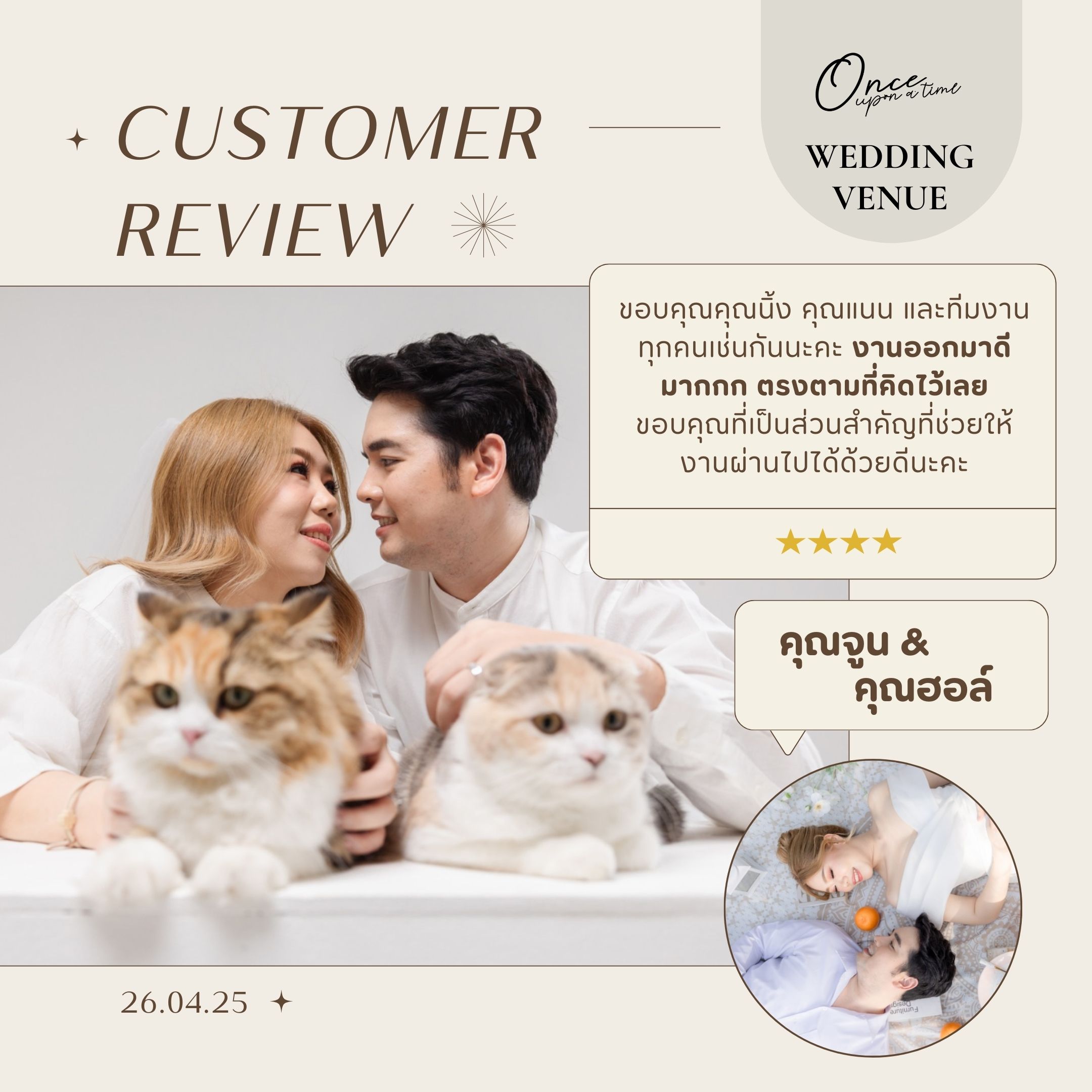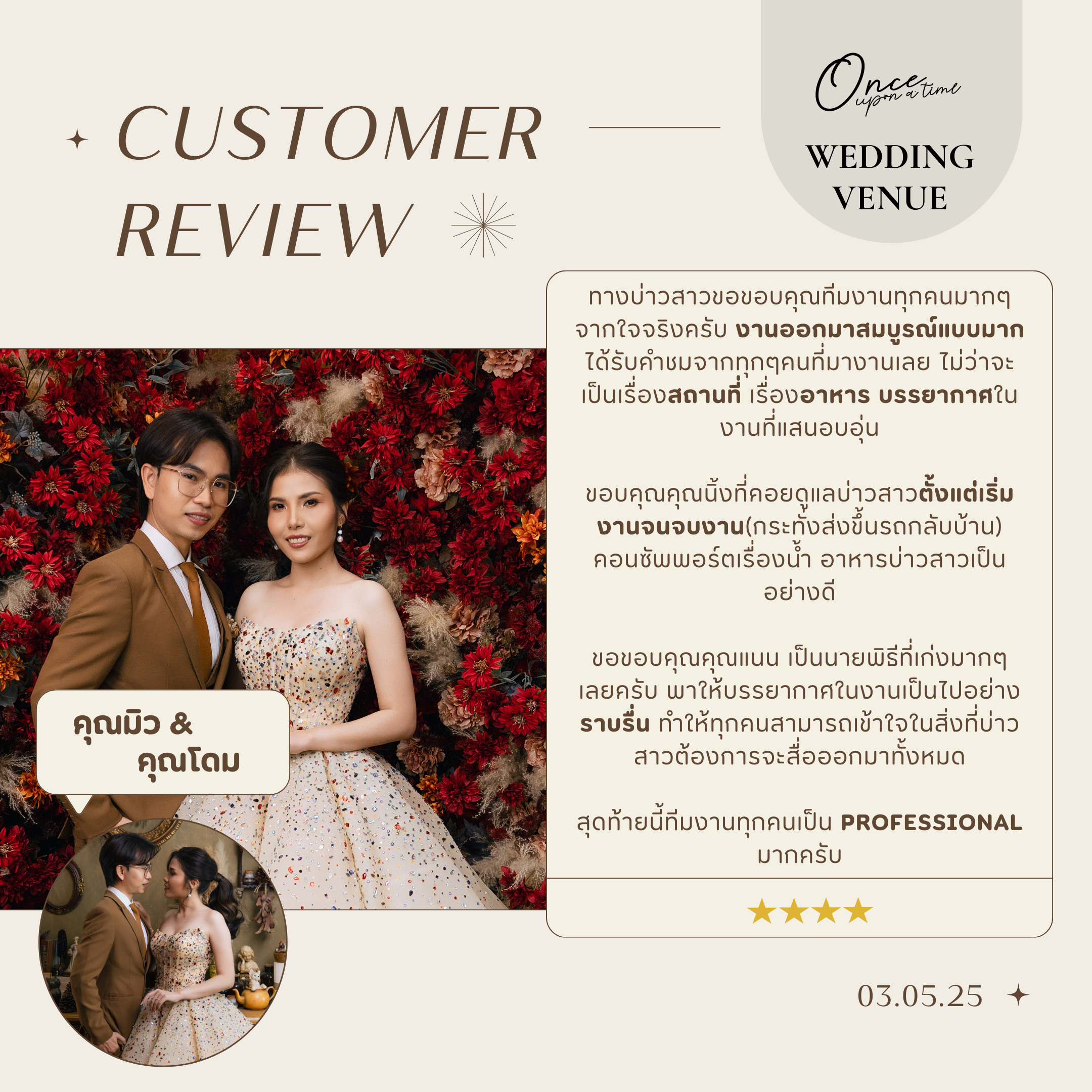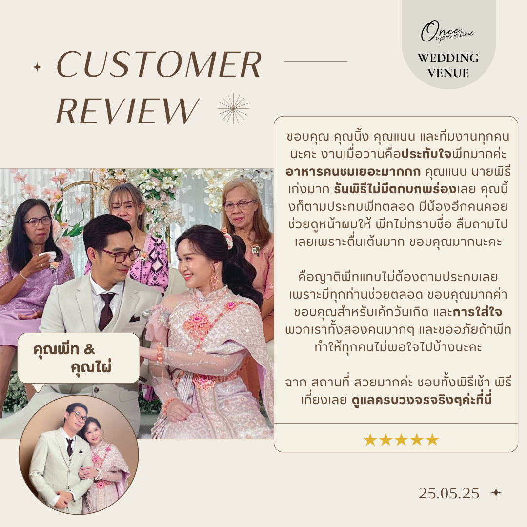 #reviewonceuponatimeขอบคุณจากหัวใจถึง 'คุณซายน์และคุณนิน' ขอบคุณที่ไว้วางใจ Once ในวันสำคัญที่สุดของชีวิตทีมงานทุกคนปลื้มใจมากที่ได้เป็นส่วนหนึ่งในความทรงจำครั้งนี้ อ่านรีวิวแล้วหายเหนื่อยเลยค่ะ ขอบคุณที่มองเห็นทุกความตั้งใจของพวกเราตั้งแต่ความละมุนของสถานที่ ไปจนถึงความใส่ใจเล็กๆ อย่างการดูแลผู้สูงวัยตลอดทั้งงาน ยินดีที่ได้ "สานฝัน" ให้วันสำคัญของคุณทั้งสอง ออกมา สมบูรณ์แบบ อย่างที่ตั้งใจค่ะ ขอให้รักครั้งนี้งดงามและยั่งยืนตลอดไปนะคะ "
