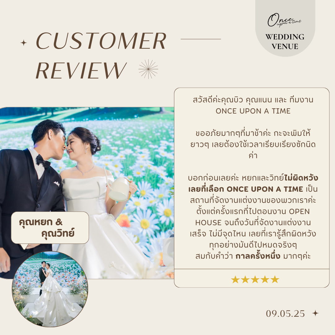 รีวิวจากคุณหยกและคุณวิทย์ ขอบคุณที่สละเวลาเขียนรีวิวอย่างยาวและละเอียด ให้กับ Once upon a timeทุกถ้อยคำที่เขียน ทุกความรู้สึกที่ถ่ายทอด ทำให้ทีมงานทุกคนชื่นใจและหายเหนื่อยทันทีค่ะ ขอบคุณที่ไว้ใจให้ Once upon a time ดูแลวันสำคัญที่สุดในชีวิตของคุณทั้งคู่ คำว่า "ขอบคุณ" อาจดูเล็กไป แต่เราขอส่งมันออกไปจากใจ…จากทีมงานทุกคนที่ตั้งใจเสิร์ฟความสุขให้เต็มที่ในทุกดีเทล ขอให้คุณหยกและคุณวิทย์มีชีวิตคู่ที่งดงาม เต็มไปด้วยความรัก ความเข้าใจ และรอยยิ้มในทุก ๆ วันนะคะ Special Thank ภาพสวยๆจาก : NP Photo "