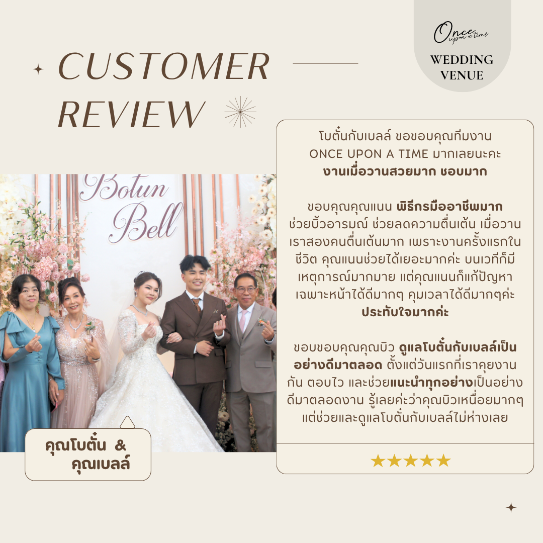 #reviewonceuponatime ขอบคุณรีวิวจากคุณโบตั๋น & คุณเบลล์นะคะ ดีใจที่ Once upon a time ได้เป็นส่วนหนึ่งของวันสำคัญของทั้งคู่ เพราะเราใส่ใจในทุกรายละเอียด ตั้งแต่สถานที่ พิธีการ ไปจนถึงทีมงานดูแลเพื่อให้ทุกอย่าง “ครบ จบ ในที่เดียว” อย่างแท้จริง ขอบคุณที่ไว้วางใจให้เราดูแลวันสำคัญในชีวิตค่ะ "