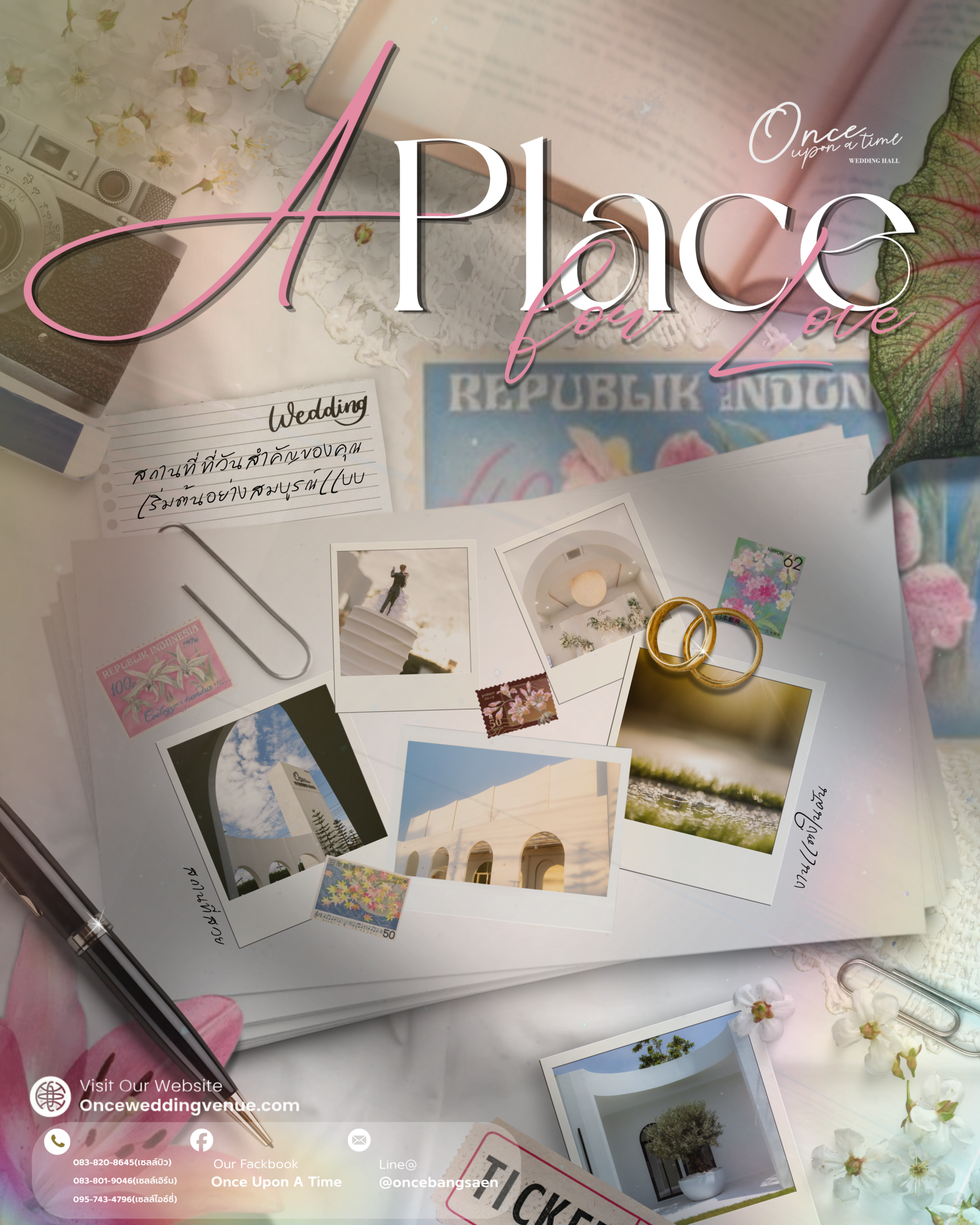 “𝐀 𝐏𝐥𝐚𝐜𝐞 𝐨𝐟 𝐥𝐨𝐯𝐞” สถานที่ที่ไม่ได้เป็นเพียงแค่โลเคชัน แต่เป็นพื้นที่ที่รวบรวมความรัก ความอบอุ่น และความทรงจำดีๆ ไว้ในวันพิเศษของคุณ ให้เรา Once upon a time ดูแลวันพิเศษของคุณ ……………………………………………………. ติดต่อสอบถาม หรือแวะมาชมสถานที่จริงได้เลยนะครับ FB : Once upon a time Website : www.onceweddingvenue.com Line@ : @oncebangsaen IG : once.weddinghall Tel : 083-820-8645 (ฝ่ายขายบิว) 092-631-1826 (ฝ่ายขายนิ้ง) 083-801-9046 (ฝ่ายขายเอิร์น,ฝ่ายขายไอซ์ซี่)