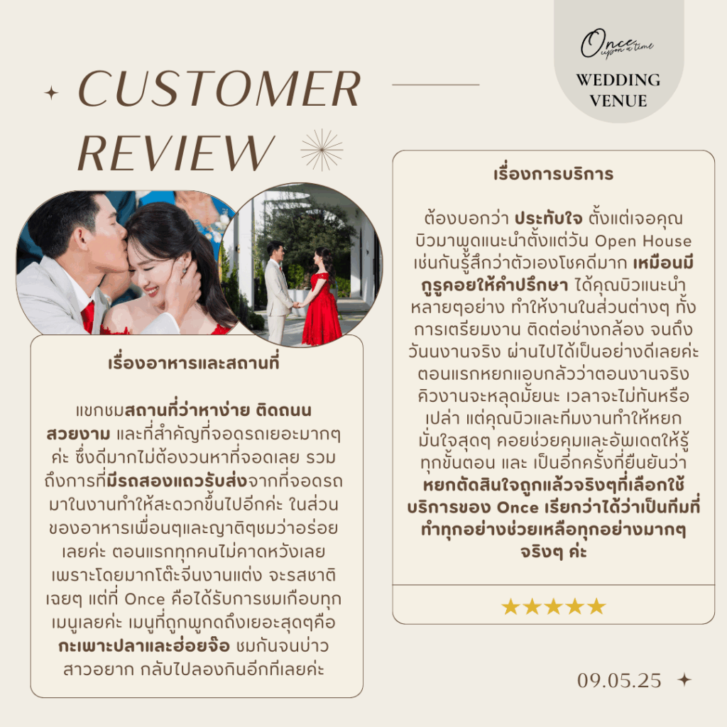 แขกชมสถานที่ว่าหาง่าย ติดถนน สวยงาม และที่สำคัญที่จอดรถเยอะมากๆค่ะ ซึ่งดีมากไม่ต้องวนหาที่จอดเลย รวมถึงการที่มีรถสองแถวรับส่งจากที่จอดรถมาในงานทำให้สะดวกขึ้นไปอีกค่ะ ในส่วนของอาหารเพื่อนๆและญาติๆชมว่าอร่อยเลยค่ะ ตอนแรกทุกคนไม่คาดหวังเลย เพราะโดยมากโต๊ะจีนงานแต่ง จะรสชาติเฉยๆ แต่ที่ Once คือได้รับการชมเกือบทุกเมนูเลยค่ะ เมนูที่ถูกพูกดถึงเยอะสุดๆคือ