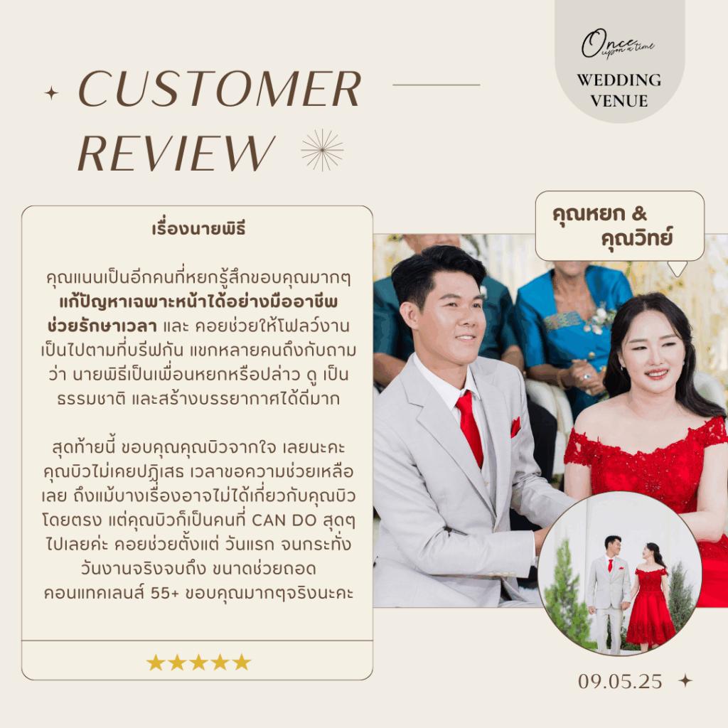 บิวมาพูดแนะนำตั้งแต่วัน Open House เช่นกันรู้สึกว่าตัวเองโชคดีมาก เหมือนมีกูรูคอยให้คำปรึกษา ได้คุณบิวแนะนำหลายๆอย่าง ทำให้งานในส่วนต่างๆ ทั้งการเตรียมงาน ติดต่อช่างกล้อง จนถึงวันนงานจริง ผ่านไปได้เป็นอย่างดีเลยค่ะ ตอนแรกหยกแอบกลัวว่าตอนงานจริง คิวงานจะหลุดมั้ยนะ เวลาจะไม่ทันหรือเปล่า แต่คุณบิวและทีมงานทำให้หยก มั่นใจสุดๆ คอยช่วยคุมและอัพเดตให้รู้ ทุกขั้นตอน และ เป็นอีกครั้งที่ยืนยันว่า หยกตัดสินใจถูกแล้วจริงๆที่เลือกใช้บริการของ Once เรียกว่าได้ว่าเป็นทีมที่ทำทุกอย่างช่วยเหลือทุกอย่างมากๆจริงๆ ค่ะ…